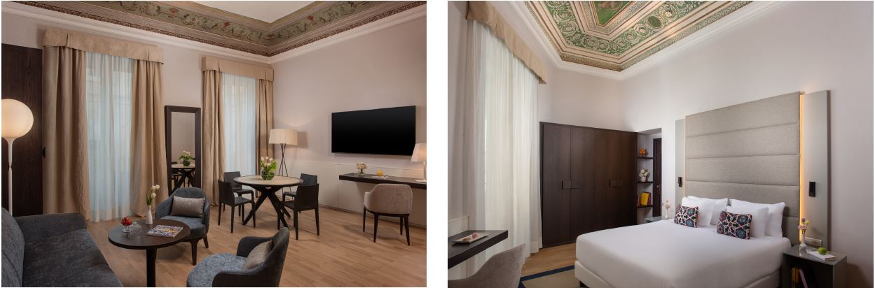 Many of the rooms conserve their original cast-iron balconies, which provide charming views of the old town, and some of the Junior Suites have ceilings with frescos painted in blue and green, restored to highlight the palazzo’s artistic heritage.